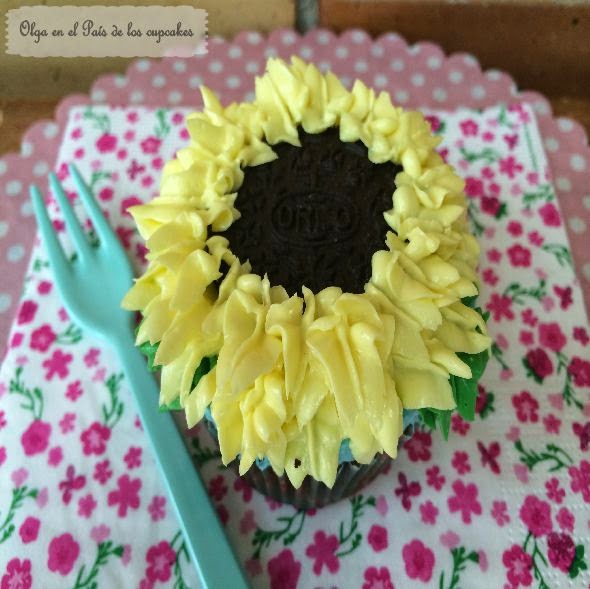 Olga!! En un curso de cupcakes que hice cuando empecé en este mundillo... practicamos el cupcake de girasol! Que bonito es! Nosotros, en vez de ponerle una galleta oreo en el centro, le pusimos chispas de chocolate negro!! Y también queda muy bonito :)